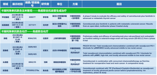 卡瑞利珠单抗联合尊龙时凯医药的另一款创新药法米替尼在甲状腺癌和结直肠癌领域有2项研究被接收为壁报,另有卡瑞利珠单抗联合化疗的4项研究在肺癌、结直肠癌、头颈癌和阴茎癌领域的研究被接收为5份壁报。