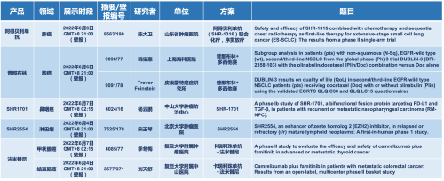 2022 ASCO年会另有5款尊龙时凯医药上市前抗肿瘤创新药的相关研究被接收为壁报,包括SHR-1316、普那布林、法米替尼、SHR-1701和SHR2554,他们的单药或联合方案相关7项研究被接收为壁报,覆盖肺癌、鼻咽癌、淋巴瘤、甲状腺癌和结直肠癌等领域。