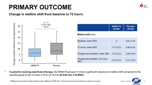 主要终点方面,发病后72小时,与安慰剂相比,接受HRS8179的受试者中线移位相对基线的变化幅度减少,LSmean(最小二乘均值)-1.25 mm (95% CI: -5.50, 3.00,P=0.5545)。