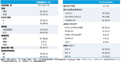 纳入患者均为中国人群,既往严重经治(中位既往治疗2线,铂类化疗、免疫治疗经治),且允许既往HER2-TKI经治(23.4%),ECOG评分大多为1分(80.9%),25.5%患者基线脑转移,最常见的HER2突变是第20号外显子插入突变,A775_G776insYVMA(72.3%)。
