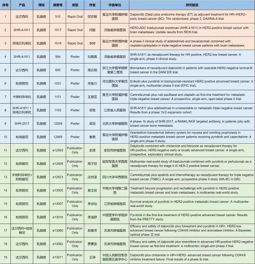 在乳腺癌领域,吡咯替尼、达尔西利、卡瑞利珠单抗、阿帕替尼、阿得贝利单抗、瑞康曲妥珠单抗(SHR-A1811)、SHR-2017,或产品间联合或联合化疗,共有19项研究入选(包括3项快速口头报道和7项壁报展示以及9项线上发表)。其中吡咯替尼占据7项、达尔西利占据6项,持续发力展现令人鼓舞的疗效;而瑞康曲妥珠单抗(SHR-A1811)、阿得贝利单抗等药物相关研究入选快速口头报告,获得业内广泛关注。