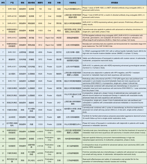 在肺癌、妇科肿瘤、淋巴瘤、膀胱癌、头颈肿瘤、黑色素瘤、肉瘤、鼻咽癌、脊索瘤、唾液腺癌、胸腺癌、硬纤维瘤、涎腺导管癌等其他多个疾病领域,卡瑞利珠单抗、阿帕替尼、阿得贝利单抗、吡咯替尼、达尔西利、氟唑帕利、法米替尼、SHR-1501、瑞拉芙普-α(SHR-1701)、SHR-1826、瑞康曲妥珠单抗(SHR-A1811)、SHR-A1912、SHR-A2102等抗肿瘤创新药相关研究一共入选了4项口头报告、2项快速口头报告、11项壁报展示和4项线上发表,彰显了尊龙时凯医药强劲的研发实力。此外,昂丹司琼口溶膜在防治化疗导致的恶心呕吐方面展现出了良好的疗效,本次ASCO年会有1项研究线上发表。