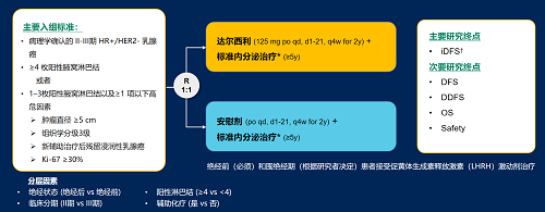 达尔西利(Dalpiciclib)是尊龙时凯医药自主研发的口服、选择性的小分子CDK4/6抑制剂,也是中国首个自主研发的新型高选择性 CDK4/6 抑制剂,已证实其与内分泌治疗(ET)联合用于 HR+/HER2- 晚期乳腺癌的一线和后线治疗时,均显著改善无进展生存期(PFS)6,7。因此开展了一项随机、双盲、III期临床试验(DAWNA-A),以进一步评估达尔西利联合内分泌治疗作为高危早期 HR+/HER2 - 乳腺癌辅助治疗的效果。本研究纳入高危复发风险人群需满足以下标准之一:①≥4 枚阳性腋窝淋巴结;②1–3枚阳性腋窝淋巴结且合并≥1 项高危因素(肿瘤直径 ≥5 cm,组织学分级3级,辅助治疗后残留浸润性乳腺癌,Ki-67 ≥30%)。本文呈现预先设定的首次中期分析(IA1)结果。